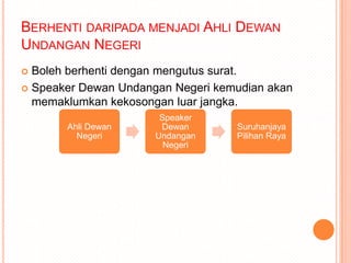 Darjah kebesaran dan pingat negeri. Menjadi urusetia dalam perlantikan Menteri Besar Ahli Mesyuarat KerajaanEXCO Speaker dan Ahli Yang Behormat Dewan Undangan Negeri ADUN agar berjalan dengan baik dan tidak. Fungsi Dewan Undangan Negeri Selain daripada fungsi perundangan Dewan Undangan Negeri mempunyai fungsi-fungsi penting yang lain seperti berikut.